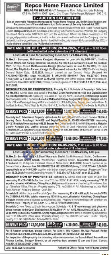 DESCRIPTION OF PROPERTIES: Schedule A: All that piece and Parcel of Open Site measuring 11 x 28-308 Sq.fts. from out of CTS No. 3889/1 ATA/TA/SA, totally, measuring 1730.88 sq.mtrs, situated at Kaktives, Chirag Nagar, Belgaum and the same is bounded by: Boundaries: East by Tahasildar Office, West by Property bearing CTS. No 3889/1 A1 A1 A/SA belongs to Jafar Malik Patel, North by Road and South by: Open Site Schedule B: All that piece and Parcel of Open Site, measuring 13 x 32416 sq.ft, from out of CTS. No. 3889/1A1 A/1 A/SA, totally, measuring 1730.88 sq.mtrs., situated at Kakatives, Chirag Nagar, Belgaum and the same is bounded by Boundaries East: Property of Mohammedgous M Tanelkhan and brothers, West: Property of Patil South: CTS. No. 3875/2 and North: Road Schedule C: Now Above said both the properties Schedule 'A' & B' were merged and given one single number to the Open Site bearing CTS No. 3889/1A1 A/1 A/SE, Measuring 724 Sq.ft. Le.(67 28 sq. mtrs.) situated at Kakatives, Chirag Nagar, Belgaum and the same is bounded by Boundaries East: Old Tahasildar Office, West Property bearing CTS. No. 3889/1A1 A/1 A/SD, South: Property bearing CTS No. 3888/1A1A/1A/SAand North Road.