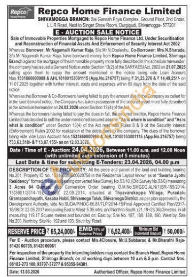 DESCRIPTION OF THE PROPERTY: All the piece and parcel of the land and tsalding bearing No 201, Property No. 152400503600620758 in the Residental Layout known as at "Swarna Jyothi Residency" formed in the land beaning converted New Survey No.53/10, (Old Survey No. 53/6) measuring 3 Acres 04 Guntas, vide Conversion Order bearing O.M.No.SMGDC.ALN(1)SR-155/2014 15(3651/2014-15), Dated: 22.09.2014, situated at Thyavarakoppa Village, Puradalu Gramapanchayath, Kasaba Hobli, Shivamoga Taluk, Shivamoga District, as per plan approved by the Development Authority, vide No SUDA/P/NOC-66.81/TLP/2014-15/Final Approved Centitled Plan/2017-18/98 x 22.05.2017 measuring East to West: 5.35 mtrs, and North to South (21.19-23.36)/2metres, in al measuring 119.17 Square metres and bounded on: East by: Site No. 187, 188, 189, 190, West by: Site No. 2010. North by: Site No. 192 and 193, South by: Road