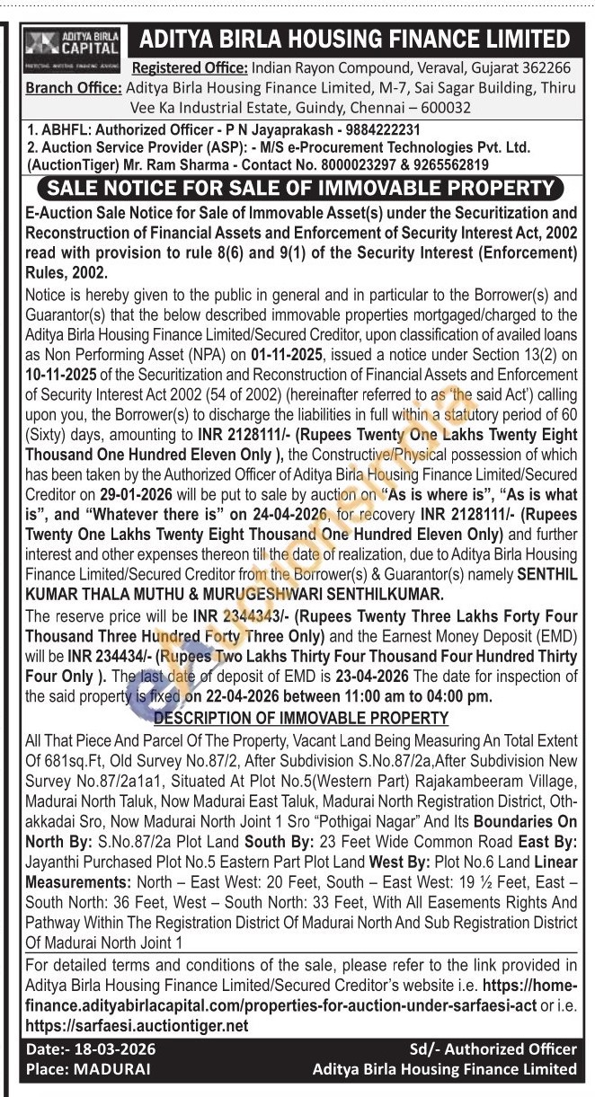 All That Piece And Parcel Of The Property, Vacant Land Being Measuring An Total Extent Of 681sq. Ft, Old Survey No.87/2, After Subdivision S.No.87/2a, After Subdivision New Survey No.87/2a1a1, Situated At Plot No.5(Western Part) Rajakambeeram Village, Madurai North Taluk, Now Madurai East Taluk, Madurai North Registration District, Oth-akkadai Sro, Now Madurai North Joint 1 Sro "Pothigai Nagar" And Its Boundaries On North By: S.No.87/2a Plot Land South By: 23 Feet Wide Common Road East By: Jayanthi Purchased Plot No.5 Eastern Part Plot Land West By: Plot No.6 Land Linear Measurements: North East West: 20 Feet, South East West: 19 ½ Feet, East -South North: 36 Feet, West South North: 33 Feet, With All Easements Rights And Pathway Within The Registration District Of Madurai North And Sub Registration District Of Madurai North Joint 1