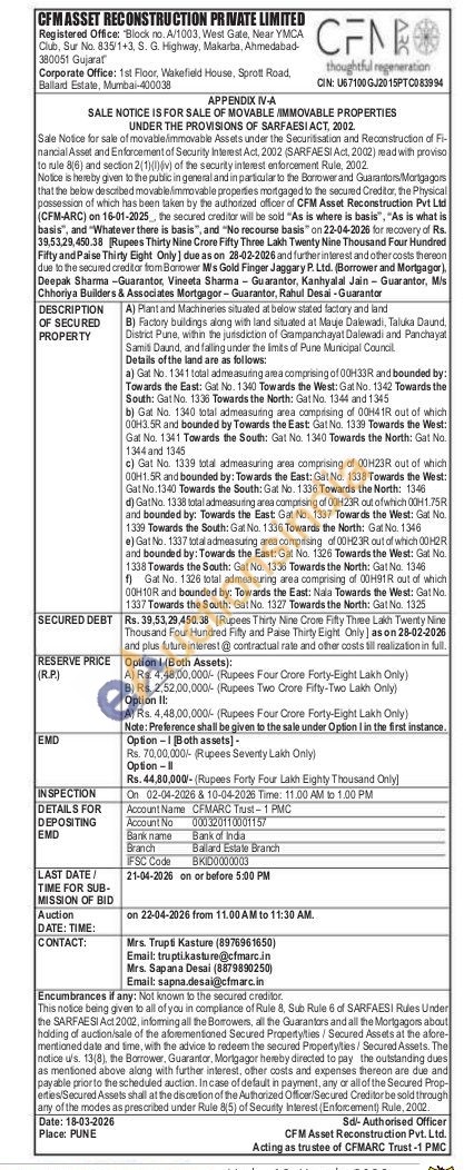 Factory buldings along with land situated at Maje Dalewadi, Taluka Daund, District Pune, within the jurisdiction of Grampanchayat Dalewadi and Panchayat Samit Daund, and falling under the limits of Pune Municipal Council Details of the land are as follows: a) Gat No. 1341 total admeasuring area comprising of 00H33R and bounded by: Towards the East: Gat No. 1340 Towards the West: Gat No. 1342 Towards the South: Gat No. 1336 Towards the North: Gat No. 1344 and 1345 bj Gat No. 1340 total admeasuring area comprising of 00H41R out of which 00H3 5R and bounded by Towards the East: Gal No. 1339 Towards the West: Gat No. 1341 Towards the South: Gat No. 1340 Towards the North: Gat No 1344 and 1345 c) Gat No. 1339 total admeasuring area comprising of 00H23R out of which 00H1.5R and bounded by: Towards the East: Gat No. 1338 Towards the West: Gat No.1340 Towards the South: Gat No. 1336 Towards the North: 1346 d) Gat No. 1338 total admeasuring area comprising of 00H23R out of which 00H1.75R and bounded by: Towards the East: Gue No. 1337 Towards the West: Gat No. 1339 Towards the South: Gat No. 1336 Towards the North: Gat No. 1346 e) Gat No. 1337 total admeasuing area comprising of 00H23R out of which 00H2R and bounded by: Towards the East: Gat No. 1326 Towards the West: Gurt No. 1338 Towards the South: Gat No. 1330 Towards the North: Gat No. 1346 f Gat No. 1326 total admeasuring area comprising of 00H91R out of which 00H10R and bounded by: Towards the East: Nala Towards the West: Gat No. 1337 Towards the South: Gat No. 1327 Towards the North: Gat No. 1325
