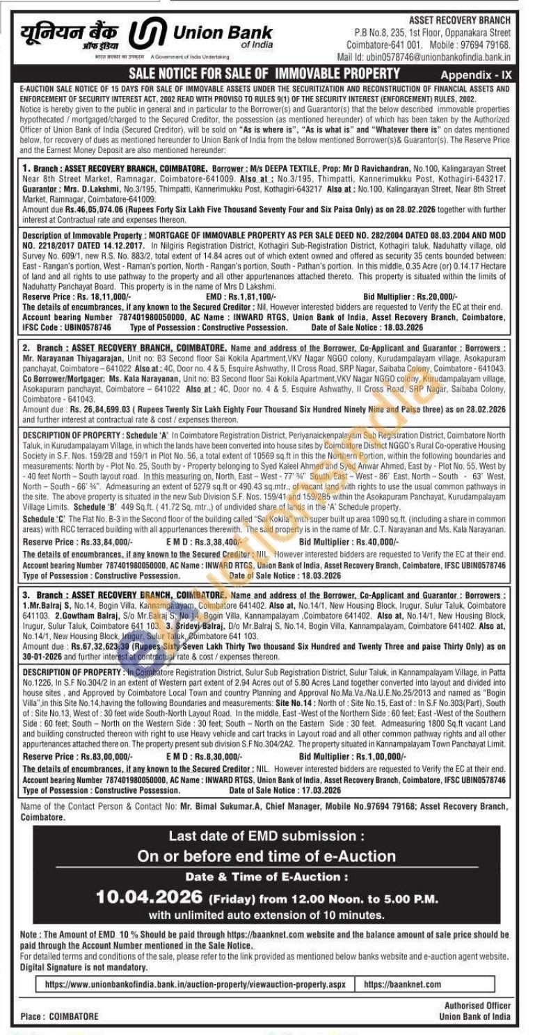 1)In Nilgiris Registration District, Kothagin Sub-Registration District, Kothagin taluk, Naduhatty vilage, old Survey No. 609/1, new R.S. No. 883/2, total extent of 14.84 acres out of which extent owned and offered as security 35 cents bounded between East-Rangan's portion, West-Raman's portion, North Rangan's portion, South-Pathan's portion. In this middle, 10.35 Acre (or) 0.14.17 Hectare of land and all rights to use pathway to the property and all other appurtenances attached thereto. This property is situated within the limits of Naduhatty Panchayat Board. This property is in the name of Mrs. D Lakshmi