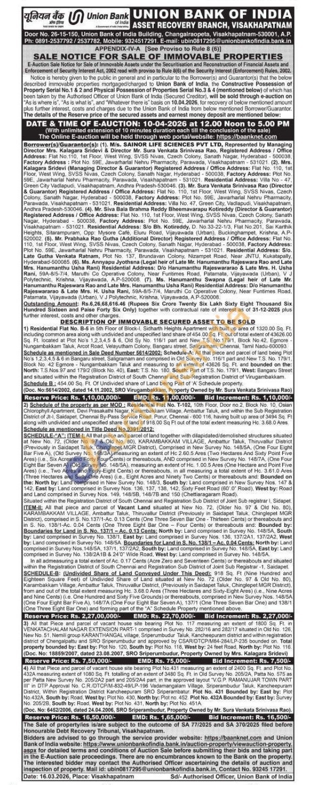 2) Residential Flat No. T-102, 10th Floor, Door no.2, Block No. 10, Osian Chlorophyll Apartment, Devi Prasakathi Nagar, Karambakkam Village, Ambattur Taluk, and within the Sub Registration District of Jt-i, Saidapet, Chennai By-Pass Service Road, Porur, Chennai-600 116, having built up area of 3494 Sq. Ft along with undivided and unspecified share of land of 918.00 Sq Ft out of the total extent measuring Ho. 3.68.0 Ares Schedule as mentioned in Title Deed No.9391/2012: SCHEDULE-"A": ITEM-1; All that piece and parcel of land together with dilapidated/demolished structures situated at New No. 72, (Older No. 97 & Old No. 80), KARAMBAKKAM VILLAGE, Ambattur Taluk, Thiruvallur District (Previously in Saidapet Taluk. Chinglepet MGR District), Comprised in New Survey No. 148/5A, (One Four Eight Bar Five A), (Old Survey No. 148/3A) measuring an extent of Hc 2.60.5 Ares (Two Hectares And Sixty Point Five Ares) (ie, Six Acres and Forty Four Cents) or thereabouts, AND comprised in New Survey No. 148/7A, (One Four Eight Bar Seven A) (Old Survey No. 148/5A), measuring an extent of Hc. 1.00.5 Ares (One Hectare and Point Five Ares) (ie., Two Acres and Forty-Eight Cents) or thereabouts, in all measuring a total extent of Hc. 3.61.0 Ares (Three Hectares and Sixty-One Ares) (ie., Eight Acres and Ninety Two Cents) or thereabouts and: Bounded on the: North by: Land comprised in New Survey No. 148/3, South by: Land comprised in New Survey Nos. 147 & 142, East by: Land comprised in Survey Nos. 136, 137, 138, 142, Sixty Feet Road (60' 0 Road), West by: Road and Land comprised in Survey Nos. 149, 148/58, 148/78 and 150 (Chettiaragaram Road). Situated within the Registration District of South Chennai and Registration Sub District of Joint Sub registrar I, Sidapet. ITEM-II; All that piece and parcel of Vacant Land situated at New No. 72. (Older No. 97 & Old No. 80). KARAMBAKKAM VILLAGE, Ambattur Taluk, Thiruvallur District (Previously in Saidapet Taluk, Chinglepet MGR District), comprised in S. No.137/1-Ac. 0.13 Cents (One Three Seven Bar One-Thirteen Cents) or thereabouts and in S. No. 138/1-Ac. 0.04 Cents (One Three Eight Bar One Four Cents) or thereabouts and: Bounded by: Boundaries for Land in S. No. 137/1-Ac. 0.13 Cents: North by: Land comprised in Survey No. 148/5A, South by: Land comprised in Survey No. 138/1, East by: Land comprised in Survey Nos. 136, 137/2A1, 137/2A2, West by: Land comprised in Survey No. 148/5A Boundaries for Land in S. No. 138/1-Ac. 0.04 Cents: North by: Land comprised in Survey Nos. 148/5A, 137/1, 137/2A2, South by: Land comprised in Survey No. 148/5A, East by: Land comprised in Survey No. 138/2A1B & 24'0' Wide Road, West by: Land comprised in Survey No. 148/5A. In all admeasuring a total extent of Ac. 0.17 Cants (Acre Zero and Seventeen Cents) or thereabouts and situated within the Registration District of South Chennai and Registration Sub District of Joint Sub Registrar-1, Saidapet. SCHEDULE-B: (Undivided Share of Land Conveyed Under This Deed); 918 Sq. Ft (Nine Hundred and Eighteen Square Feet) of Undivided Share of Land situated at New No. 72 (Older No. 97 & Old No. 80). Karambakkam Village, Ambattur Taluk, Thiruvallur District, (Previously in Saidapet Taluk, Chinglepet MGR District), from and out of the total extent measuring Hc. 3.68.0 Ares (Three Hectares and Sixty-Eight Ares) (ie, Nine Acres and Nine Cents) (i.e. One Hundred and Sixty Five Grounds) or thereabouts, comprised in New Survey Nos. 148/5A (One Four Eight Bar Five A), 148/7A (One Four Eight Bar Seven A), 137/1 (One Three Seven Bar One) and 138/1 (One Three Eight Bar One) and forming part of the "A" Schedule Property mentioned above.