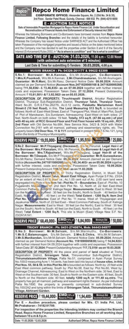 3 )All the piece and parcel of land situated at Trichy Registration District, Srirangam Taluk, Thiruverumbur Sub-Registrar District, Thirumalaisamuthiram Village, Patta No.51, comprised in Ayan Punjai Survey No. 100/2 measuring Acre 1.14 cents, has been laid into layout of house sites, in this Plot Nos. 55, 58 & 59, in this Plot No.59 is bounded as follows: North by: 20 feet wide East West common pathway, South by: Plot No.58, East by: Plot No.60, West by: Drainage Channel, Admeasuring: East to West on the Northern side: 30 feet, East to West on the Southern side: 30 feet, South to North on the Eastern side: 40 feet, South to North on the Western side: 40 feet, totally 1200 sq.ft. or 111.48 sq.mtrs. The property has got all manool, pathway and easement rights thereon. As per individual Patta No. 1890, the property is presently comprised in sub-divided Survey No. 100/2A2 and lying within the limits of Srirangam Taluk, Thirumalaisamuthiram Village, Abhirami Garden.