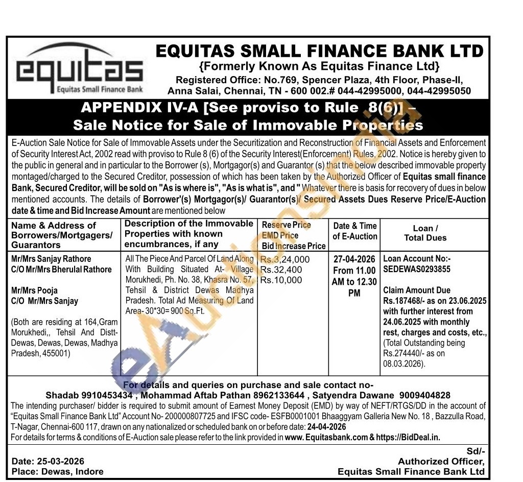 All The Piece And Parcel Of Land Along With Building Situated At- Village Morukhedi, Ph. No. 38, Khasra No. 57, Tehsil & District Dewas Madhya Pradesh. Total Ad Measuring Of Land Area-30*30=900 Sq.Ft.