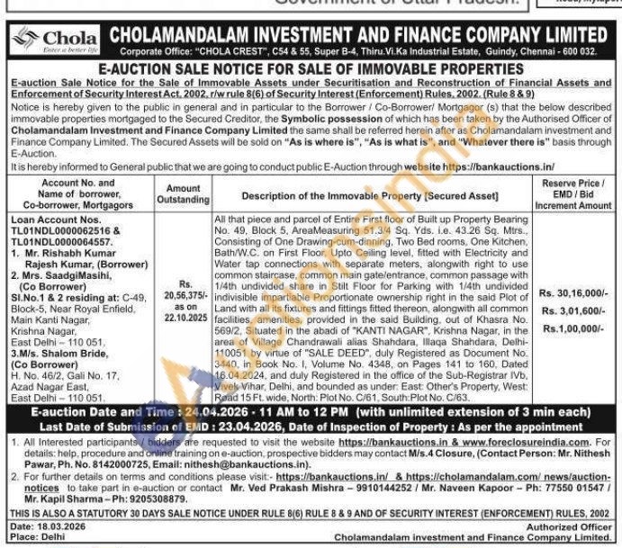 All that piece and parcel of Entire First floor of Built up Property Bearing No. 49, Block 5. AreaMeasuring 51.3/4 Sq. Yds. i.e. 43.26 Sq. Mtrs., Consisting of One Drawing-cum-dinning, Two Bed rooms. One Kitchen, Bath/W.C. on First Floor, Upto Ceiling level, fitted with Electricity and Water tap connections with separate meters, alongwith right to use common staircase, common main gate/entrance, common passage with 1/4th undivided share in Stilt Floor for Parking with 1/4th undivided - indivisible impartiable Proportionate ownership right in the said Plot of Land with all its fixtures and fittings fitted thereon, alongwith all common facilities, amenities, provided in the said Building, out of Khasra No. 569/2, Situated in the abadi of "KANTI NAGAR", Krishna Nagar, in the area of Village Chandrawali alias Shahdara, Illaqa Shahdara, Delhi-110051 by virtue of "SALE DEED", duly Registered as Document No. 3440, in Book No. 1, Volume No. 4348, on Pages 141 to 160, Dated. 16.04.2024, and duly Registered in the office of the Sub-Registrar IVb. Vivek Vihar, Delhi, and bounded as under: East: Other's Property, West: Road 15 Ft. wide, North: Plot No. C/61, South: Plot No. C/63.