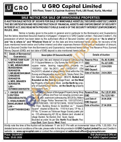 All that right, sitle and interest of property admeasuring 31.11 Square Meters i.e. City Survey No. 1530 paiki 31.11 EMD square meter, bearing nagarpalika, property no. 10052431 (Old No.2431) and 10052431/1 (Old No.2431/1) situated at village Mouje Talod within the City Survey and Nagarpalika area of Talod, Taluka Talod, Dis trict Sabarkantha, State Gujarat-383215. Butted and Bounded on the East by Collage Road, on the West by Property of Nathabhai Modi, on the North by prap-erty of Sureshkumar Sasha, on the South by property of Rajnikant Soni.