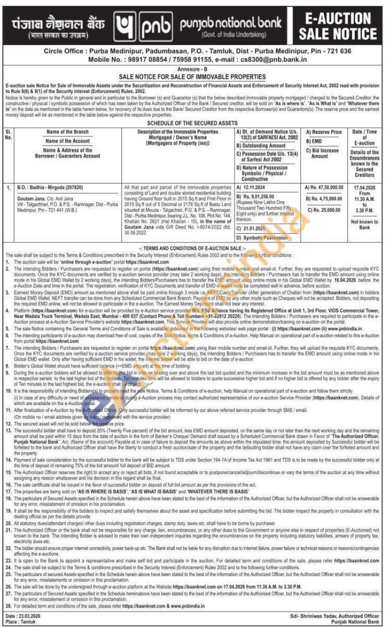 All that part and parcel of the immovable properties consisting of Land and double storted residental buiding having Ground floor built in 2015 Soft and First Floor in 2016 Sig out of 5 Decimal or 2178 Sift of Bastu Land me of stueled at Mouza-Talpache PO &PS-Rannag Dist-Purbo Medinipur, bearing No. 108, Plot No. 144. Khatian No. 2821 (Hal Khatian 15) in the name o Goutam Jana vide Gift Deed No. 1-8074/2022 dd 30.06.2022