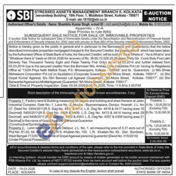 Factory land & Building measuring 66 sataks and building and shed thereon at Jalan Industrial Complex, Gate No.-1. Lane No.-2, Mouza-Bipprannapara, Domjur, Howrah. J.L. No 27. Deed No. 5404/2011 R.S. Dag No. 4411 & 4412. L.S. Dag No. 4416 & 4417 having area 16 Decimal), 5405/2011 RS. Dag No. 4408 & 4409, L.S. Dag No. 4413 8 4414 having area 29 Decimal) and 5406/2011 (R.S. Dag No. 4352 & 4353, L.S. Dag No. 4357 & 4358 having area 21 Decimall in the name of Gopal Agarwal-Personal Guarantor