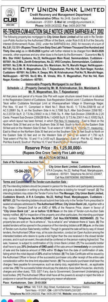 All that piece and parcel of a House Site Plot with super structure raised there on is situated in the Registration District of Cuddalore. Sub-Registration District Joint-1,Cuddalore Revenue Taluk within Cuddalore Municipal Limit at Vilvarayanatham Village in Shanmuga Nagar Plot Nos. 10 and 11. Comprised in Ward No.7. Block No.43 1) T.S.No.2358/18 out of AC.5.28981 Sq. ft. on the Southem Side in Ac 3.7086 Sq.ft. After Sub-Division 2358/182-Ac2 23724 Sqft 2) T.S. No: 2358/2 in Ac 3.7085 Sq. ft. After Sub-Division 2358/28 Ac.2.20 Cents Present Sub-Division 2358/2818 Ac 142455 Sq.ft. 3) TS. N№ 2361/1-Ac010552 Sq upon which layout has been formed, in which Plot Nos. 10 measuring: East to West on the Northem Side 30 feet and on the Southern Side 30 feet. South to North on the Eastern Side 50 feet and on the Western Side 53 feet. To an extent of 1,680 Sq. Plot No. 11 measuring East to West on the Northern Side 35 feet and on the Southern Side 35 feet South to North on the Eastern Side 53 feet and on the Western Side 47 feet to an extent of 1,750 sqft Total extent of Plot No. 10 and 11 is 3,430 sq.ft. Boundaries: East of Plot No. 12. West of Plot Nos. 19 and 8, South of Plot Nos 16,17 and 18 and North of Municipal Road
