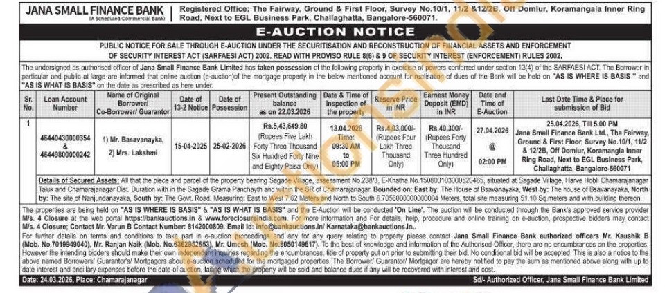 Details of Secured Assets: All that the piece and parcel of the property bearing Sagade Village, assessment No 238/3, E-Khatha No. 150800103000520465, situated at Sagade Village, Harve Hobli Chamarajanagar Taluk and Chamarajanagar Dist. Duration with in the Sagade Grama Panchayth and within the SR of Chamarajanagar. Bounded on: East by: The House of Bsavanayaka, West by: The house of Bsavanayaka, North by: The site of Nanjundanayaka, South by: The Govt. Road. Measuring: East to West 7.62 Meters and North to South 6.7056000000000004 Meters, total site measuring 51.10 Sq.meters and with building thereon.