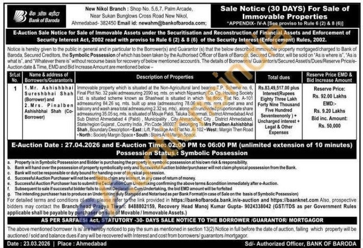 Immovable property which is situated at the Non-Agricultural land bearing T.P. Scheme no. 6, Final Plot No. 32 paiki admeasuring 2090 sq. mts. on which Nipamkunj Co. Op. Housing Society Ltd. is situated scherme known as Shashwat is situated in which 1st floor, Flat No. A-101 admeasuring 84.26 sq. mts. bult up area (admeasuring 78.06 sq. mis rera carpet area and balcony and wash area total admeasuring 2.32 sq. mts), along with undivided proportionate share admeasuring 35.05 sq. mts. is situated of Mouje Paldi, Taluka Sabarmati District.Ahmedabad And Sub District Ahmedabad 4 (Paldi), Municipality City Ahmadabad City District Ahmedabad, State/region Gujarat. Country India. Pin Code 380007, Belonging To Mrs Pinalben Ashishbhai Shah, Boundary Description East: Lift, Passage And Flat No.A-102-West: Margin Then Road North: Society Margin Space South: Stairs And Margin Space.