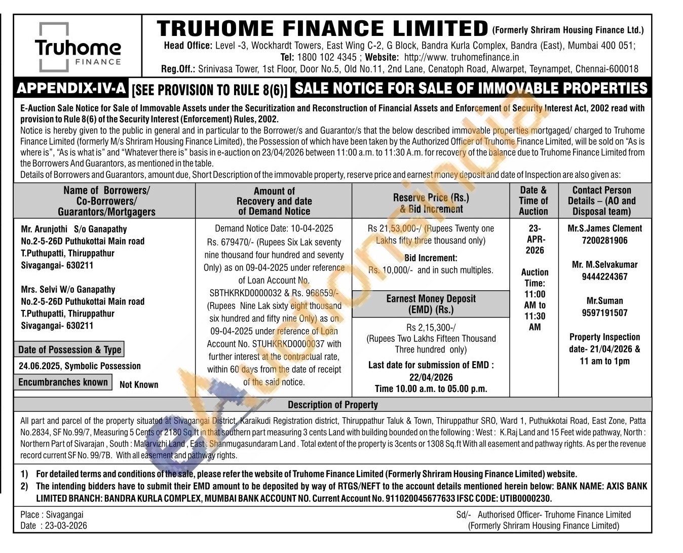 All part and parcel of the property situated at Sivagangai District, Karaikudi Registration district, Thiruppathur Taluk & Town, Thiruppathur SRO, Ward 1, Puthukkotai Road, East Zone, Patta No.2834, SF No.99/7, Measuring 5 Cents or 2180 Sq.ft in that southern part measuring 3 cents Land with building bounded on the following: West: K.Raj Land and 15 Feet wide pathway, North: Northern Part of Sivarajan, South: Malarvizhi Land, East: Shanmugasundaram Land. Total extent of the property is 3cents or 1308 Sq.ft With all easement and pathway rights. As per the revenue record current SF No. 99/7B. With all easement and pathway rights.