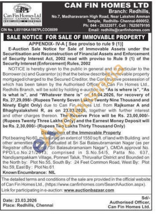 Plot bearing No 60, measuring an extent of 1550 sq ft. of land with Building and other amenities thereon, situated at Sri Sai Balasubramanian Nagar (as per Registrar office record: "Sri Balasubramaniam Nagar"), CMDA approval No. PPD/Lo.No.21/2013, comprised in S.No.54/5, Patta No. 637. Nandiyampakkam Village, Ponneri Taluk, Thiruvallur District and Bounded on the North by: Plot No.55, South By: 24 Feet Common Road, West By: Plot No.59, East By: Plot No.61 Known Encumbrance: NIL