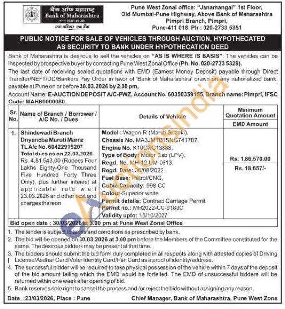 Model: Wagon R (Maruti Suzuki). Chassis No. MA3JMTB1SNG741787, Engine No. K10CNC13888, Type of Body: Motor Cab (LPV). Regd. No. MH-12 UM-0613, Regd. Date: 30/08/2022 Fuel Base: Petrol/CNG, Cubic Capacity: 998 CC Colour-Superior white Permit details: Contract Carriage Permit Permit no.: MH2022-CC-9183C Validity upto: 15/10/2027