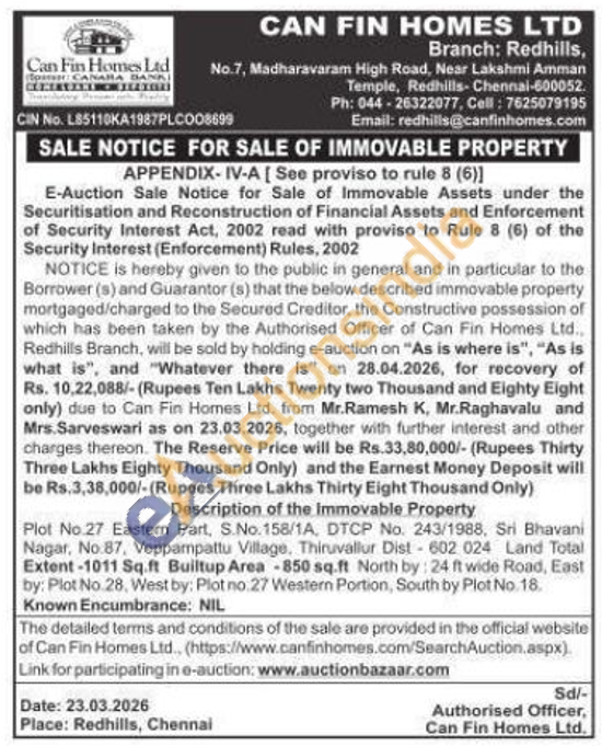 Plot No.27 Eastern Part, S.No.158/1A, DTCP No. 243/1988, Sri Bhavani Nagar, No.87, Veppampattu Village, Thiruvallur Dist-602 024 Land Total Extent-1011 Sq.ft Builtup Area -850 sq.ft North by: 24 ft wide Road, East by: Plot No.28, West by: Plot no. 27 Western Portion, South by Plot No. 18. Known Encumbrance: NIL