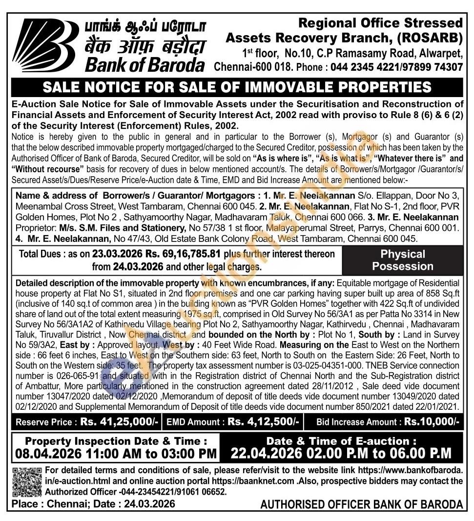 Detailed description of the immovable property with known encumbrances, if any: Equitable mortgage of Residential house property at Flat No S1, situated in 2nd floor premises and one car parking having super built up area of 858 Sq.ft (inclusive of 140 sq.t of common area) in the building known as "PVR Golden Homes" together with 422 Sq.ft of undivided share of land out of the total extent measuring 1975 sq.ft, comprised in Old Survey No 56/3A1 as per Patta No 3314 in New Survey No 56/3A1A2 of Kathirvedu Village bearing Plot No 2, Sathyamoorthy Nagar, Kathirvedu, Chennai, Madhavaram Taluk, Tiruvallur District, Now Chennai district and bounded on the North by: Plot No 1, South by: Land in Survey No 59/3A2, East by: Approved layout, West by: 40 Feet Wide Road. Measuring on the East to West on the Northern side: 66 feet 6 inches, East to West on the Southern side: 63 feet, North to South on the Eastern Side: 26 Feet, North to South on the Western side: 35 feet. The property tax assessment number is 03-025-04351-000. TNEB Service connection number is 026-065-91 and situated with in the Registration district of Chennai North and the Sub-Registration district of Ambattur, More particularly mentioned in the construction agreement dated 28/11/2012, Sale deed vide document number 13047/2020 dated 02/12/2020, Memorandum of deposit of title deeds vide document number 13049/2020 dated 02/12/2020 and Supplemental Memorandum of Deposit of title deeds vide document number 850/2021 dated 22/01/2021.
