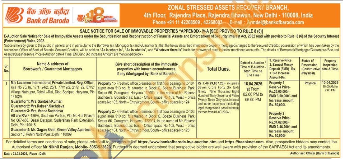 Property 1:- Freehold office premises on first floor bearing no C-104, super area 513 sq. ft. situated in Block C, Spaze Business Park, Sector 66, Gurugram, Haryana 122001, in the name of Mr. Rakesh Sachdeva. Bounded as: East-Office space No 103, West-office space No 105, North-Entry/corridor, South-office space No 124
