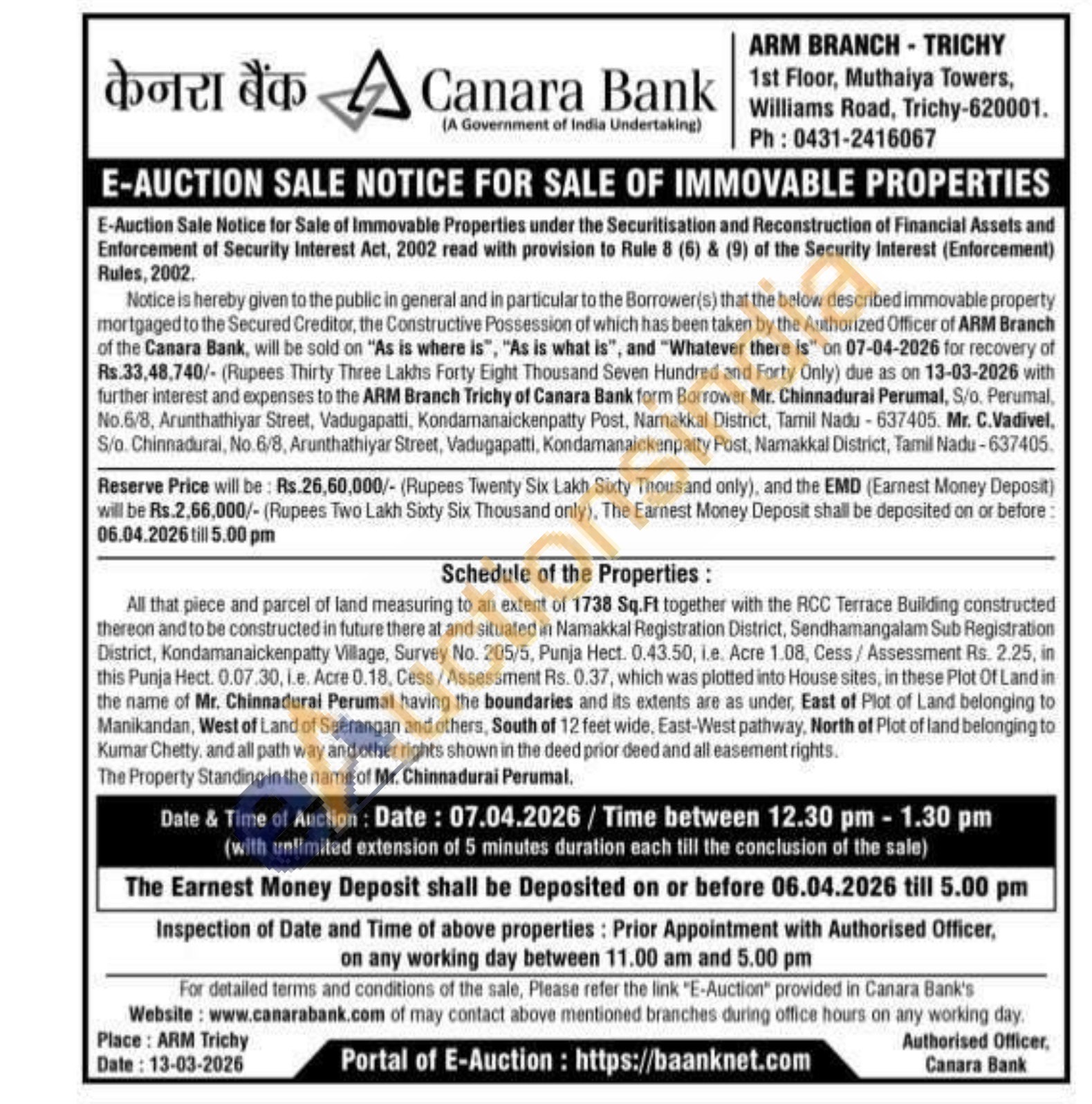 All that piece and parcel of land measuring to an extent of 1738 Sq.Ft together with the RCC Terrace Building constructed thereon and to be constructed in future there at and situated in Namakkal Registration District, Sendhamangalam Sub Registration District, Kondamanaickenpatty Village, Survey No. 205/5, Punja Hect. 0.43.50, i.e. Acre 1.08, Cess/Assessment Rs. 2.25, in this Punja Hect. 0.07.30, i.e. Acre 0.18, Cess/Assessment Rs. 0.37, which was plotted into House sites, in these Plot Of Land in the name of Mr. Chinnadurai Perumal having the boundaries and its extents are as under, East of Plot of Land belonging to Manikandan, West of Land of Seerangan and others, South of 12 feet wide, East-West pathway, North of Plot of land belonging to Kumar Chetty, and all path way and other rights shown in the deed prior deed and all easement rights.