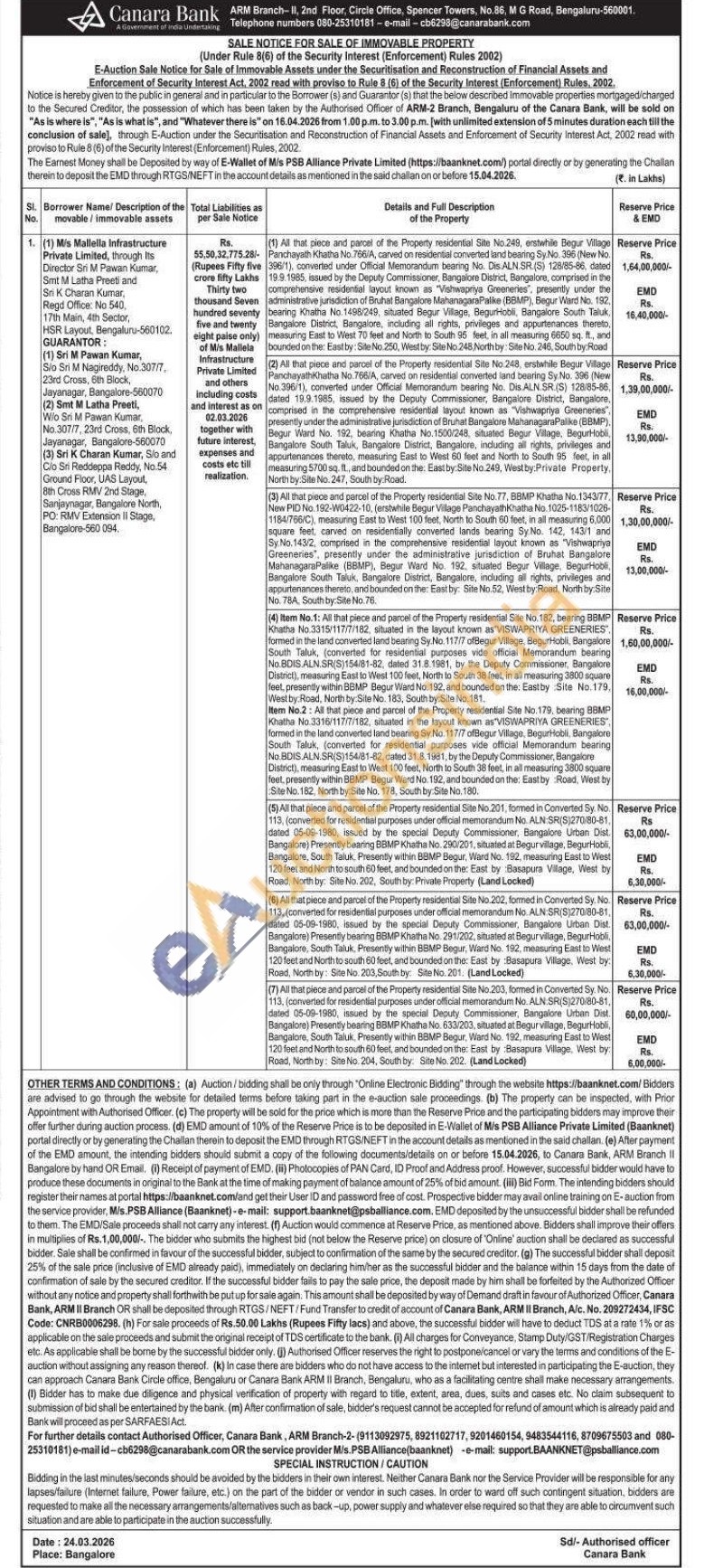contact Authorised Officer, Canara Bank, ARM Branch-2-(9113092975, 8921102717, 9201460154, 9483544116, 8709675503 and 080-25310181)