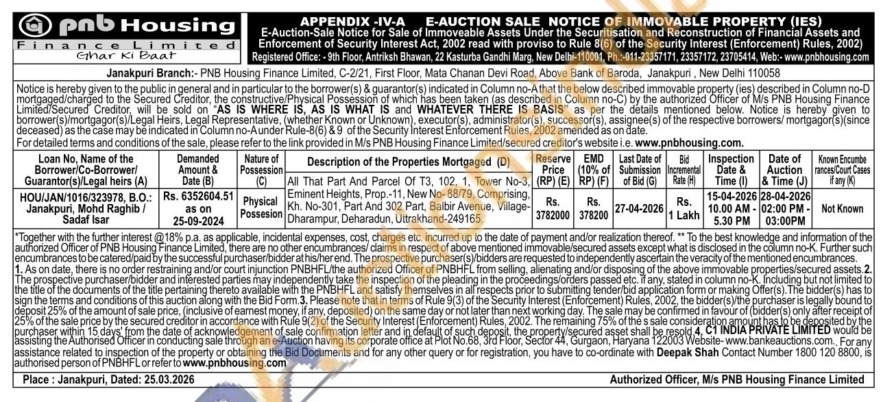 All That Part And Parcel Of T3, 102, 1, Tower No-3, Eminent Heights, Prop.-11, New No-88/79, Comprising, Kh. No-301, Part And 302 Part, Balbir Avenue, Village-Dharampur, Deharadun, Uttrakhand-249165.