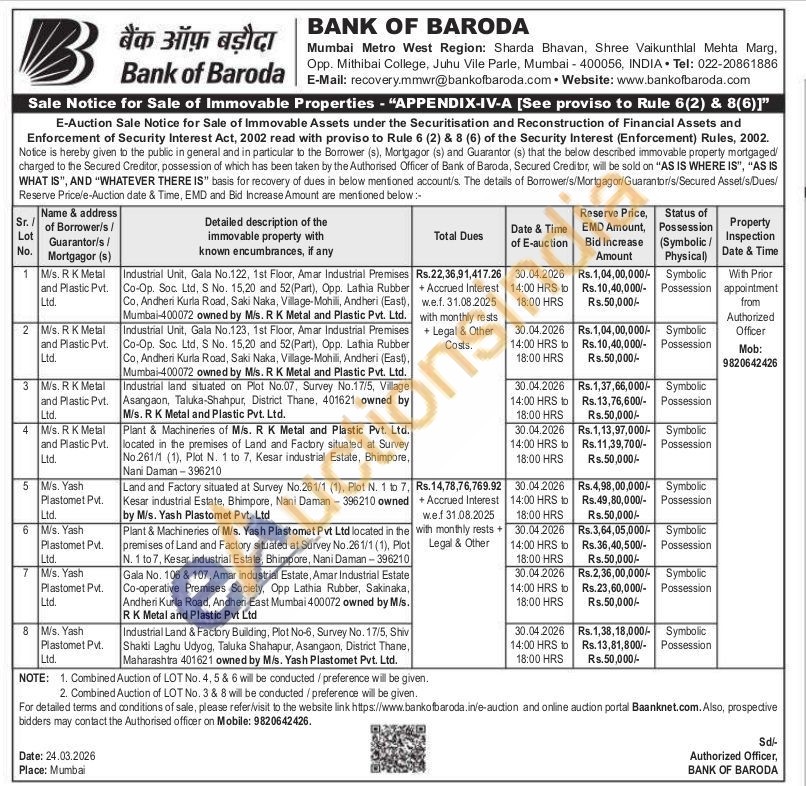Plant & Machineries of M/s. Yash Plastomet Pvt Ltd located in the premises of Land and Factory situated at Survey No.261/1 (1), Plot N. 1 to 7, Kesar industrial Estate, Bhimpore, Nani Daman-396210