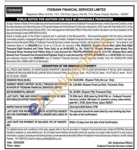 ALL PIECE AND PARCEL OF MORTGAGED PROPERTY BEARING F NO F-1, 1ST FLOOR SHIVDHAM-II P NO-26 SHIV NAGAR-A HARNATHPURA KALWAR ROAD JAIPUR-302012 RAJASTHAN, Bounded by: East-PLOT NO 25, West-PLOT NO 27, North-PLOT NO 16, South-ROAD