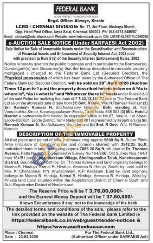 All that piece and parcel of Villa 2 admeasuring approx 5600 Sq.ft. Super Plinth Area (inclusive of common areas and common shares) with 3542.25 Sq.ft. undivided share in land measuring approx 7085.25 Sq.ft. situated at Dr. Thomas Avenue, Patta No.3355, comprised in Survey No. 164/28B, Old Survey Nos. 164/1 then 164/B1 part of Injambakkam Village, Sholinganallur Taluk, Kancheepuram District, Bounded on: North by. Dr. Thomas Avenue and land originally belongs to Meena B. Hinduja, Komal B. Hinduja, Amreeta B. Hinuja, South by: land sold to Mrs. K. Chellammal, P.N. Arunachalam, K.P. Kailasam, East by land originally belongs to Meena B. Hinduja, Komal B. Hinduja, Amreeta B. Hinduja, West by: Private land Land situated within the Registration District of Chennai South and Sub-Registration District of Neelankarai.
