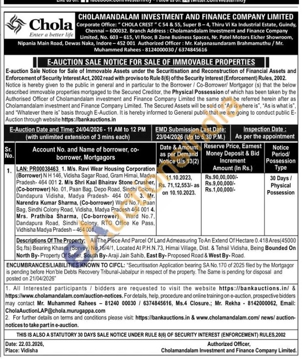 All The Piece And Parcel Of Land Admeasuring To An Extend Of Hectare 0.418 Ares (45000 Sq.fts) Bearing Khasra (Survey) No. 16/4/1, Located At P.H.N.73, Hirnai Village, Dist. & Tehsil Vidisha, Being Bounded On