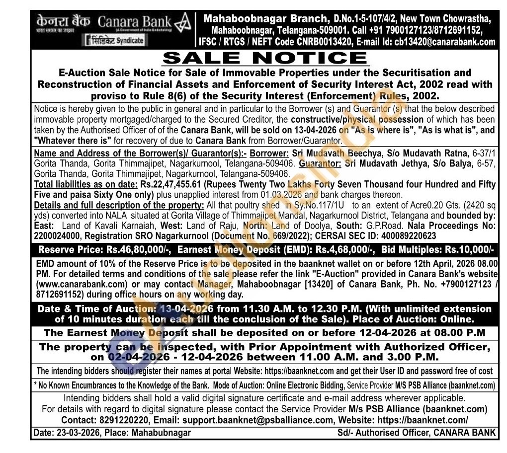 Details and full description of the property: All that poultry shed in Sy.No.117/1U to an extent of Acre0.20 Gts. (2420 sq yds) converted into NALA situated at Gorita Village of Thimmajipet Mandal, Nagarkurnool District, Telangana and bounded by: East: Land of Kavali Karnaiah, West: Land of Raju, North: Land of Doolya, South: G.P.Road