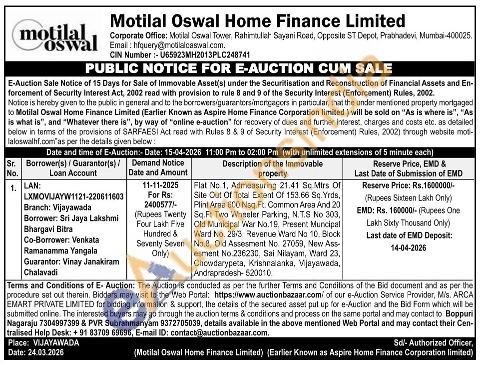 Flat No.1, Admeasuring 21.41 Sq.Mtrs Of Site Out Of Total Extent Of 153.66 Sq. Yrds, Plint Area 600 Nsq. Ft, Common Area And 20 Sq.Ft Two Wheeler Parking, N.T.S No 303, Old Municipal War No. 19, Present Muncipal Ward No. 29/3, Revenue Ward No 10, Block No.8, Old Assesment No. 27059, New Ass-esment No.236230, Sai Nilayam, Ward 23, Chowdarypeta, Krishnalanka, Vijayawada, Andrapradesh-520010.