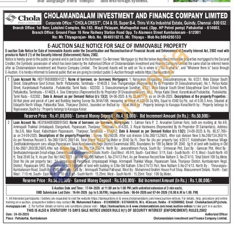 Descriptions of the property/Properties: Survey. No-260/2B, After sub division S.No.260/13,260/5, After sub division New S.No.260/13A.260/14, As per Revenue Record S. No-260/13A1C.260/14A, Total Extent 189.52 Sq.Meter or 2040 Sq Ft, Door No (As per property tax) 4/201/7, Kabisthalam Revenue Village Seethalakshmipuram seru village, Papanasam Taluk, Kumbakonam Regn District Swamimalai SRO, Boundaries for 189 Sq.Meter OR 2040 Sg ft of land with building in Old S.No-260/1,260/28,260/5, After sub division New S.No. 260/13A, 260/14. North By: Jeevarathinam Punjai, South By: Srinivasan Plot, East By: Ganesan Plot, West By: Seethalakshmipuram Small village, Cement Road, Measurement Details: North-East West: 49.9 ft, South-East West: 51 ft, East-South North: 41 ft, West-South North :40 ft, Total 2040 Sq ft. As per Doc No.1842/2021: Survey No. Old Natham S. No-274/13 Part, As per Revenue Record New Natham S. No-274/13, Total Extent 109 Sq. Meter, Door No (As per property tax): 51, Umpalappadi Panchayat, Umpalappadi Village, Ammapalli Thaikkal Village, Papanasam Taluk, Thanjavur District, Kumbakonam Regd. District, Papanasam SRO, Boundaries for 109 Sq.Meter of land with building in S.No-Old Natham S.No-274/13 Part, New Natham S.No-274/13. North By: Thiruvaiyaru-Kumbakonam Road, South By: PWD Riverside, East By: Ammapalli Thaikkal Pallivasal, West By: Muhammed Ibrahim House Fruit Shop. Measurement Details: North - East West: 7.10 mt, South-East West: 7.10 mt, East-South North: 15.25mt, West - South North: 15.25mt: Total: 109 Sq.Meter..