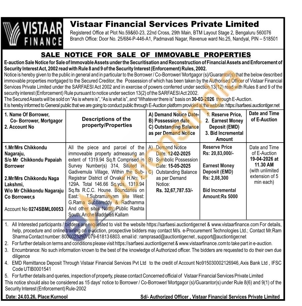 All the piece and parcel of the immoveable property admeasurig an extent of 1319.94 Sq.ft Comprised in Survey Number(s) 314, Situted in Gadivemula Village, Within the Sub-C) Registrar District of Orvakal H.No: 1-129A. Total 146.66 Sq.yds, 1319.94 Sq.fts R.C.C. House. Boundaries on East: T.Subramanyam site West: G.Rama Subbareddy & Radhamma And other sites North: Public Rashta South: Anche Maddeleti Kallam