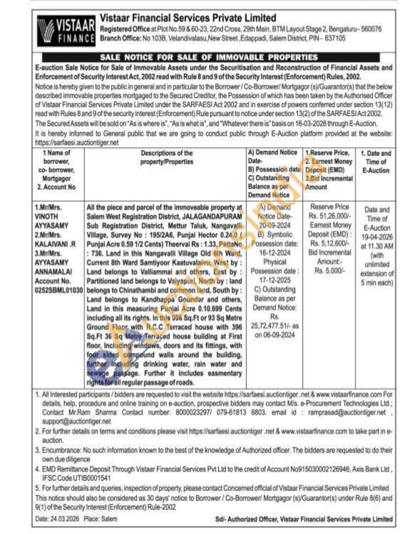 All the piece and parcel of the immoveable property at Salem West Registration District, JALAGANDAPURAM Sub Registration District, Mettur Taluk, Nangavalli Village, Survey No: 195/2A6, Punjai Hector 0.24.0 ( Punjai Acre 0.59 1/2 Cents) Theervai Rs: 1.33, PattaNo 736. Land in this Nangavalli Village Old 6th Ward, Current 8th Ward Samtiyoor Kaatuvalaivu, West by: Land belongs to Valliammai and others, East by: Partitioned land belongs to Vaiyapuri, North by: land belongs to Chinathambi and common land, South by: Land belongs to Kandhappa Gounder and others, Land in this measuring Punjai Acre 0.10.699 Cents including all its rights. In this 996 Sq.Ft or 93 Sq Metre Ground Floor with R.C.C Terraced house with 396 Sq.Ft 36 Sq Metre Terraced house building at First floor, Including windows, doors and its fittings, with four sided compound walls around the building, further including drinking water, rain water and sewage passage. Further it includes easmentary rights for all regular passage of roads