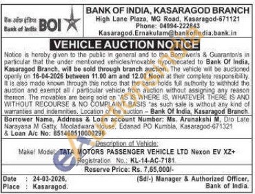 Make/ Model: TATA MOTORS PASSENGER VEHICLE LTD Nexon EV XZ+ Registration No.: KL-14-AC-7181 Situated at Survey No. 94/1B (Old Survey No. 104/18), All above plots situated at Village Nav Nagapur, Tal. & Dist. Ahmednagar