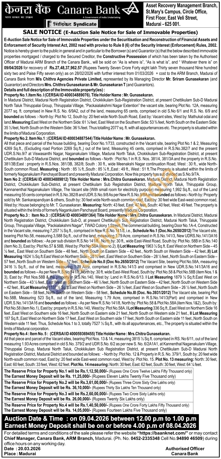 Details and full description of the Immovable property(ies): Property No.4: Item No. 5: (CERSAI ID 400059369455) Title Holder Name: Mrs. Chitra Gunasekaran : All that piece and parcel of the Vacant sites, bearing Plot Nos. 13 & 14, measuring 3815½ Sq.ft. comprised in RS. No 6/11, out of the land measuring 1.93 Acres comprised in old S.No. 379/2 and UDR S.No. 6/2 as per new S. No. 6/2A1A1, at Kannenthal Naganakulam Village, Thiruppalai Group, Madurai North Taluk, Chokkikulam Sub Registration District, at present Chettikulam Sub-D Madurai North Registration District, Madurai District and bounded as follows: - North by: Plot No. 12 & Property in R.S. No. 379/1, South by: 20 feet wide North-south common road, East by: 20 feet wide East-west common road, West by: Plot No. 15. Plot No. 13 measuring: North: 30 feet, East: 60 feet, South: 33 feet, West: 62 feet. Plot No. 14 measuring: North: 30 feet, East: 62 feet, South: 30 feet, West: 64 1/4 feet