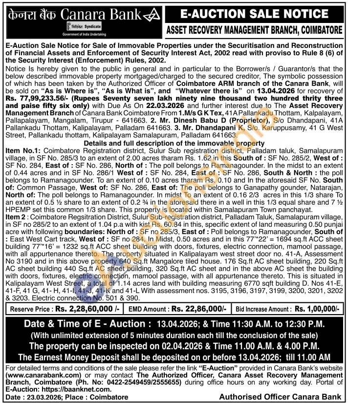 Item 2: Coimbatore Regsitration District, Sulur Sub-registration district, Palladam Taluk, Samalapuram village, in SF no 285/2 to an extent of 1.04 p.a with kist Rs. 60.84 in this, specific extent of land measuring 0.50 punjai acre with following boundaries: North of: SF no 285/3, East of: Poll belongs to Ramanagounder, South of : East West Cart track, West of: SF no 284. In Midst, 0.50 acres and in this 77*22' = 1694 sq.ft ACC sheet building 77*16' = 1232 sq.ft ACC sheet building with doors, fixtures, electric connection, mamool passage, with all appurtenance thereto. The property situated in Kalipalayam west street door no. 41-A, Assessment No 3190 and in this above property 640 Sq.ft Mangalore tiled house. 176 Sq.ft AC sheet building, 220 Sq.ft AC sheet building 440 Sq.ft AC sheet building, 320 Sq.ft AC sheet and in the above AC sheet the building with doors, fixtures, electric connection, mamool passage, with all appurtenance thereto. This is situated in Kalipalayam West Street, a total of 1.14 acres land with building measuring 6770 sqft building D. Nos 41-E, 41-F, 41 G, 41-H, 41-1, 41-J, 41-K and 41-L With assessment nos. 3195, 3196, 3197, 3199, 3200, 3201, 3202 & 3203. Electric connection No. 501 & 390