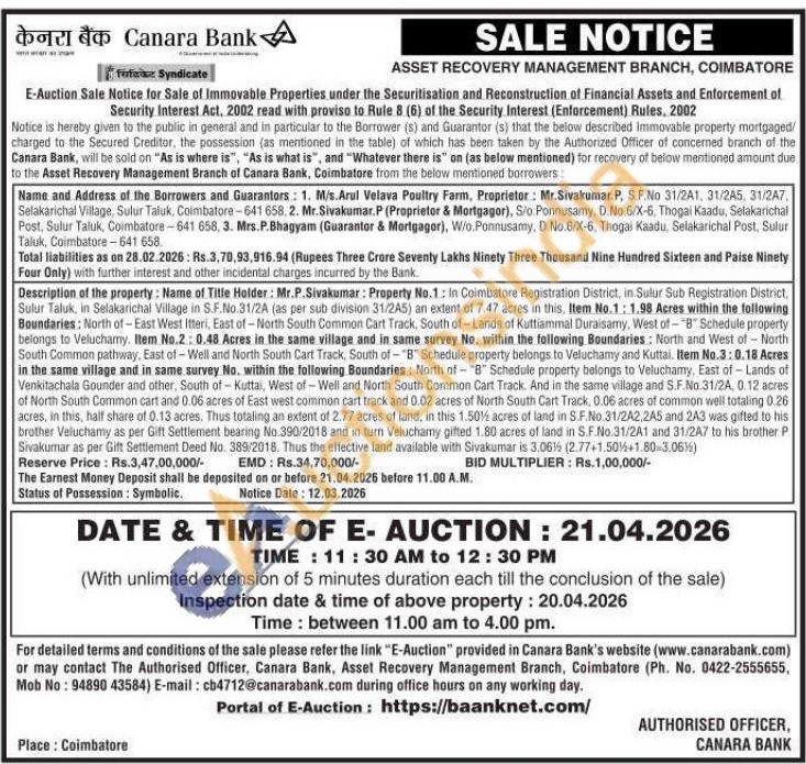 Description of the property: Name of Title Holder: Mr.P.Sivakumar: Property No.1: In Coimbatore Registration District, in Sulur Sub Registration District, Sulur Taluk, in Selakarichal Village in S.F.No.31/2A (as per sub division 31/2A5) an extent of 7.47 acres in this, Item No.1: 1.98 Acres within the following Boundaries: North of-East West Itteri, East of North South Common Cart Track, South of Lands of Kuttiammal Duraisamy, West of "B" Schedule property belongs to Veluchamy. Item No.2: 0.48 Acres in the same village and in same survey No. within the following Boundaries: North and West of North South Common pathway, East of-Well and North South Cart Track, South of "B" Schedule property belongs to Veluchamy and Kuttai. Item No.3: 0.18 Acres in the same village and in same survey No. within the following Boundaries: North of "B" Schedule property belongs to Veluchamy, East of - Lands of Venkitachala Gounder and other, South of Kuttai, West of-Well and North South Common Cart Track. And in the same village and S.F.No.31/2A, 0.12 acres of North South Common cart and 0.06 acres of East west common cart track and 0.02 acres of North South Cart Track, 0.06 acres of common well totaling 0.26 acres, in this, half share of 0.13 acres. Thus totaling an extent of 2.77 acres of land, in this 1.50 1/2 acres of land in S.F.No.31/2A2,245 and 2A3 was gifted to his brother Veluchamy as per Gift Settlement bearing No.390/2018 and in turn Veluchamy gifted 1.80 acres of land in S.F.No.31/2A1 and 31/2A7 to his brother P Sivakumar as per Gift Settlement Deed No. 389/2018. Thus the effective land available with Sivakumar is 3.06 1/2 (2.77+1.50 +1.80-3.06 1/2)