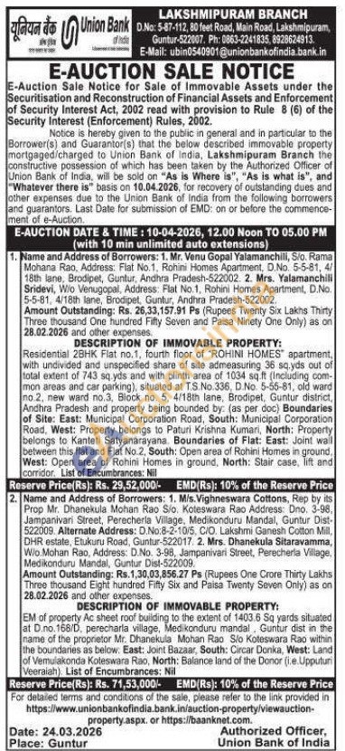 Residential 28HK Flat no.1, fourth floor of "ROHINI HOMES apartment, with undivided and unspecified share of site admeasuring 36 sq.yds out of total extent of 743 sq.yds and with plinth area of 1034 sq.ft (Including com-mon areas and car parking), situated at T.S.No.336, D.No. 5-55-81, old ward no.2, new ward no.3, Block no. 5, 4/18th lane, Brodipet, Guntur district, Andhra Pradesh and property being bounded by: (as per doc) Boundaries of Site: East: Municipal Corporation Road, South: Municipal Corporation Road, West: Property belongs to Paturi Krishna Kumari, North: Property belongs to Kanteti Satyanarayana, Boundaries of Flat: East: Joint wall between this flat and Flat No.2, South: Open area of Rohini Homes in ground, West: Open area of Rohini Homes in ground, North: Stair case, lift and corridor