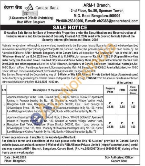 Apartment bearing Flat No. C-04, Ground Floor, C Block, "KINGS SQUARE" Apartment located in Property bearing Sy. No. 189, Situated at Kodathi Village, Varthur Hobli, 1 Bangalore East Taluk, Bangalore Urban District- 560035, East Land belongs to Shivanajappa Sy no. 188, West: Property of Shivahanumanthappa in Sy No. 190. North Land Belongs to Krishna Reddy in Sy No. 192, South: 40 ft road thereafter Sy. No. 79