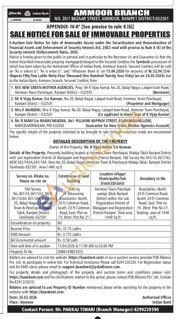 Details of the Property: Presently building located at Ammoor Town Panchayat, Walaja Taluk Ranipet District with sub registration District of Walajapet and Registration District Ranipet, Old Survey No.361/1A, 361/1A3, NEW 361/1A3A,361/1A4, Door No 20, Balaji Nagar, Ammoor Town & Panchayat Walaja Taluk, Ranipet District Tamilnadu 632501. Area-1440 sq ft
