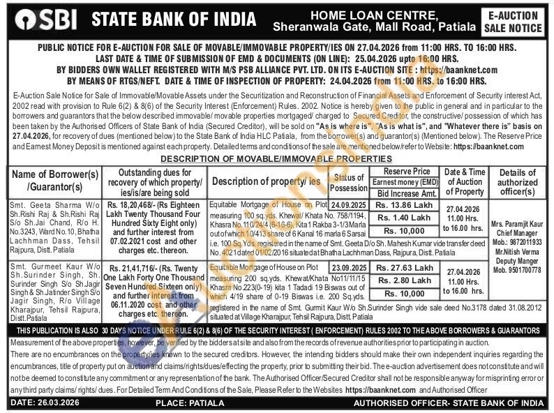 Equitable Mortgage of House on Plot measuring 100 sq.yds. Khewat/ Khata No. 758/1194, Khasra No. 110/24/4 (6-16-6), Kita 1 Rakba 3-1/3Marla out of which 10/413 share of 6 Kanal 16 maria 6 Sarsai i.e. 100 Sq. Yds. registered in the name of Smt. Geeta D/o Sh. Mahesh Kumar vide transfer deed No. 4021 dated 01/02/2016 situatedat Bhatha Lachhman Dass, Rajpura, Distt. Patiala