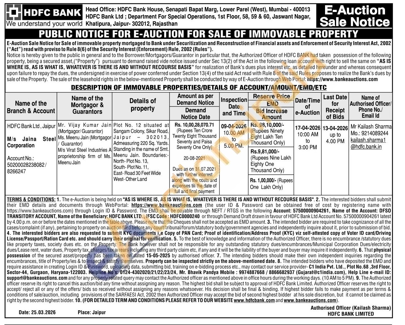 Plot No. 12 situated at Sangam Colony, Sikar Road, Jaipur 302013, Admeasuring 220 Sq. Yards. Standing in the name of Smt. Meenu Jain. Boundaries:-North-Plot No. 13, South-Plot No. 11, East-Road 30 Feet Wide West-Other Land