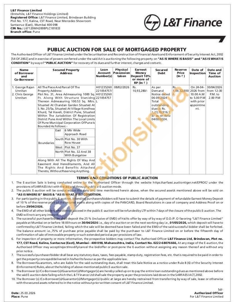 Plot No. 31, Area Admeasuring 1000 Sq. Ft. Along With Structure Stanidng Thereon Admeasuring 100.53 Sq. Mtrs. L Situated At Chandan Garden Situated At S. No. 25/5a, Situated At Village Kondhwa Khurd, Tal Haveli, District Pune, Situated Within The Jurisdiction Of Registration District Pune And Within The Local Limits Of Pune