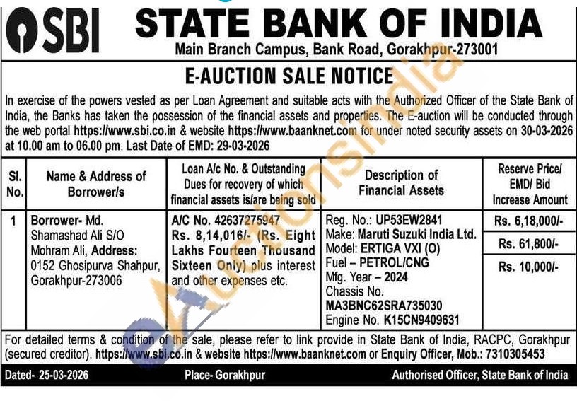 Reg. No.: UP53EW2841 Make: Maruti Suzuki India Ltd. Model: ERTIGA VXI (O) Fuel - PETROL/CNG Mfg. Year - 2024 Chassis No. MA3BNC62SRA735030 Engine No. K15CN9409631