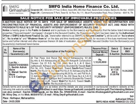 All That Piece And Parcel Plot No.A-8 Admeasuring 101.88 Sq.mtrs & A-9 Admeasuring 96.29sq.mtr Alongwith Construction Thereon Out Of R.S. No. 232 Hissa No.4 & 5 At E Ward, Jadhavwadi, Kolhapur and Commonly Bounded By-Toward East-Plot No. A10, Toward West-Road, Toward South-Road, Toward North Plot No.A-1 & A-2 And Plot No.A-10 Admeasuring 96.29 Sq.mtrs, Plot No. A-11 Admeasuring 96.29 Sq. mt. and Plot No.A-12 Admeasuring 96.29 Out Of R.S. No. 232 Hissa No.4 & 5 A1 E Ward, Jadhavwadi, Kolhapur And Commonly Bounded By-Toward East- Plot No. A-13, Toward West-Plot No.A-9, Toward South-Road, Toward North- Plot No.A-3A-4 & A-5