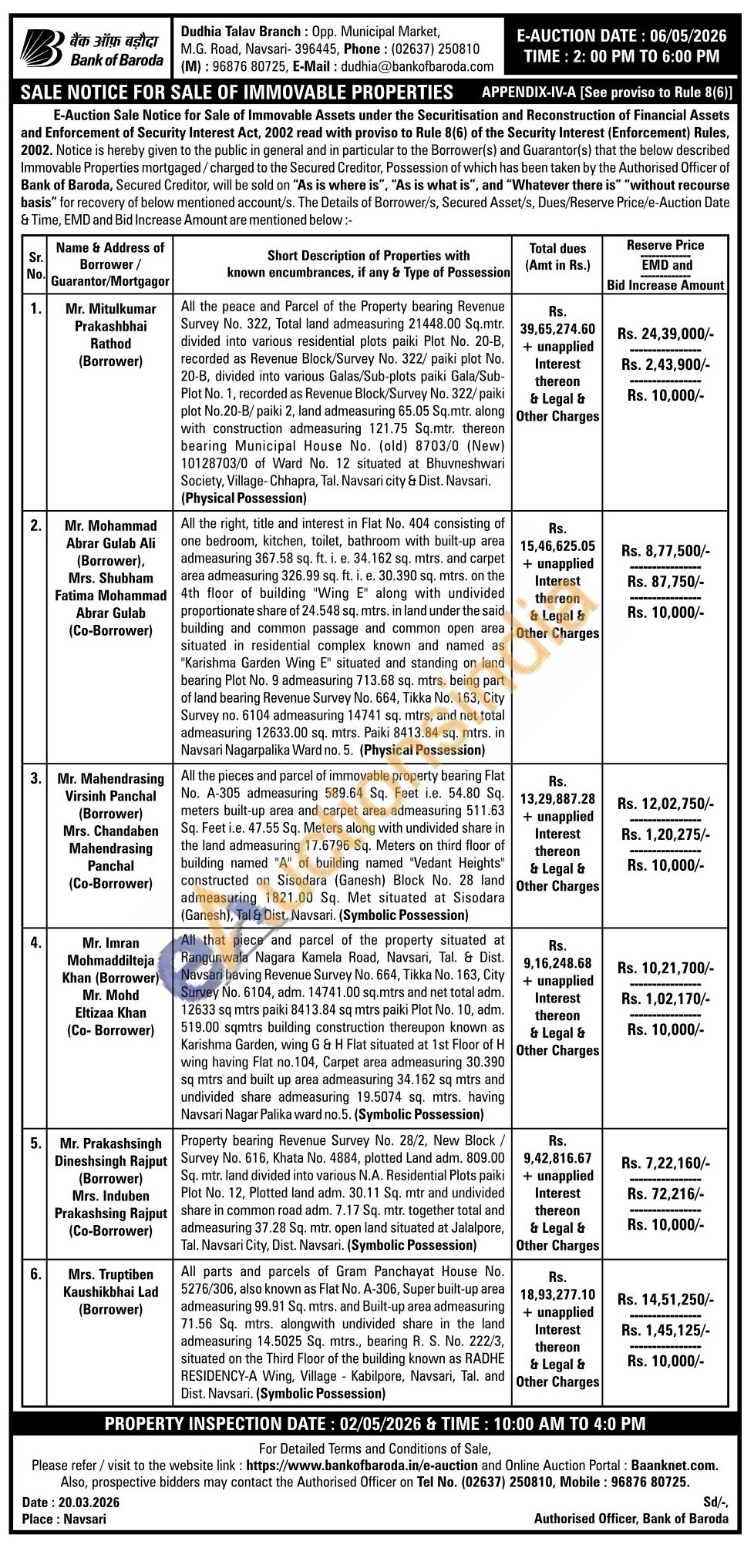 All the right, title and interest in Flat No. 404 consisting of one bedroom, kitchen, toilet, bathroom with built-up area admeasuring 367.58 sq. ft. i. e. 34.162 sq. mtrs. and carpet area admeasuring 326.99 sq. ft. i. e. 30.390 sq. mtrs. on the 4th floor of building "Wing E" along with undivided proportionate share of 24.548 sq. mtrs. in land under the said building and common passage and common open area situated in residential complex known and named as "Karishma Garden Wing E" situated and standing on land bearing Plot No. 9 admeasuring 713.68 sq. mtrs. being part of land bearing Revenue Survey No. 664, Tikka No. 163, City Survey no. 6104 admeasuring 14741 sq. mtrs, and net total admeasuring 12633.00 sq. mtrs. Paiki 8413.84 sq. mtrs. in Navsari Nagarpalika Ward no. 5. (Physical Possession)