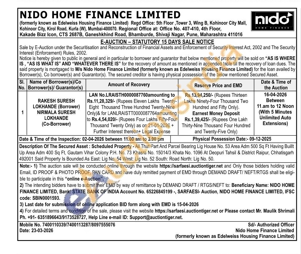 Description Of The Secured Asset: Scheduled Property - All That Part And Parcel Bearing Lig House No. 53 Area Adm 500 Sq Ft Having Buillt Up Area Adm 400 Sq Ft, Gautam Vihar Colony P.H. No. 73 Khasra No. 15014/3 Khata No. 1096 At Deopuri Tahsil & District Raipur, Chhatisgarh 492001 Said Property Is Bounded As East: Lig No. 54 West: Lig No. 52 South: Road North: Lig No. 50