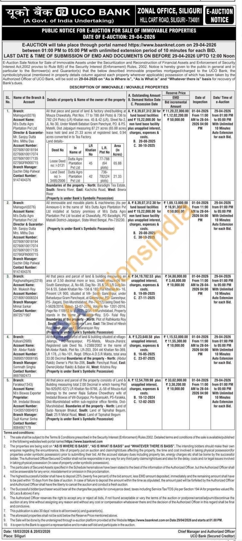 2) All immovable and movable plants & machineries (As per Annexure-I) in the name of M/s Dutta Agro Plantation Pvt Ltd installed at factory premises of M/s Dutta Agro Plantation Pvt Ltd located at Chawafully, PO Baradighi, PS Matialli District-Jalpaiguri, State-West Bengal, Pin-735230