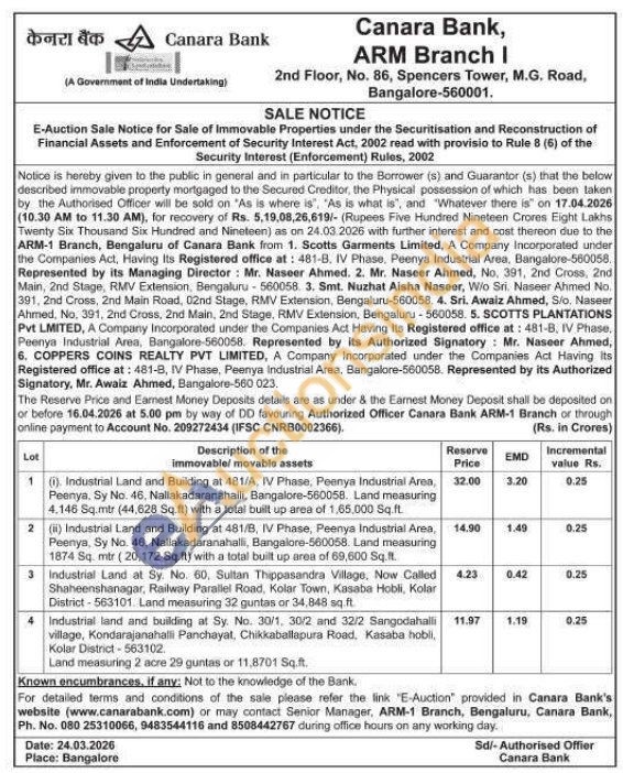 3) Industrial Land at Sy. No. 60, Sultan Thippasandra Village, Now Called Shaheenshanagar, Railway Parallel Road, Kolar Town, Kasaba Hobli, Kolar District-563101 Land measuring 32 guntas or 34,848 sq.ft.