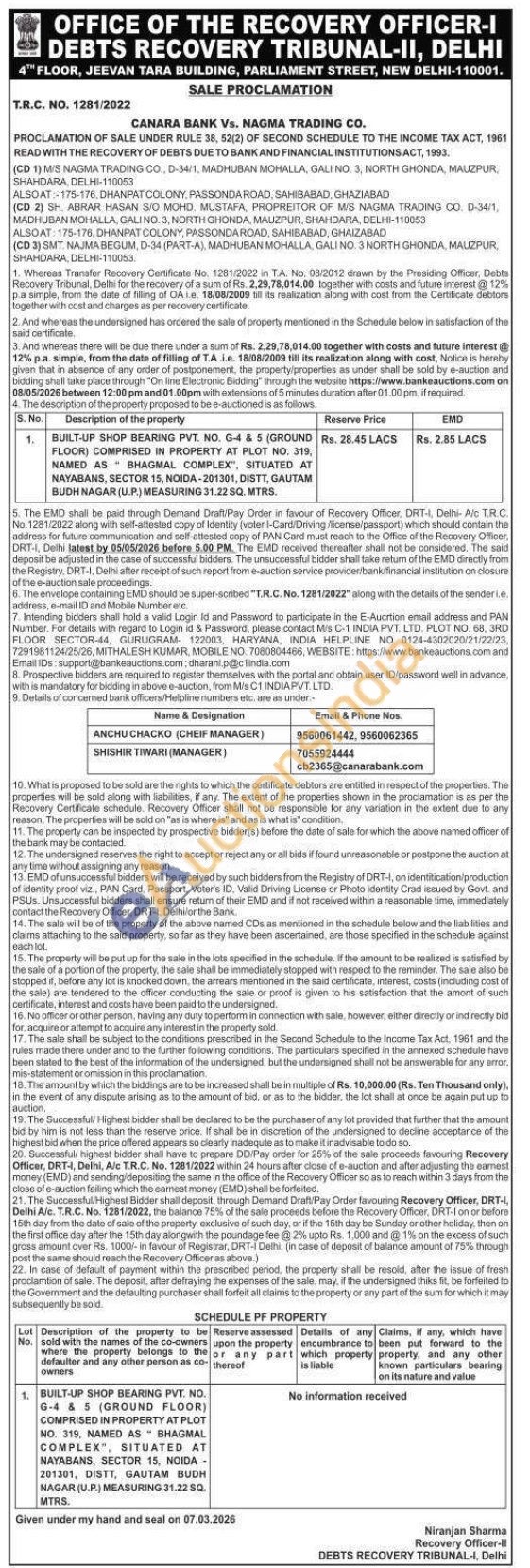Description of the property : BUILT-UP SHOP BEARING PVT. NO. G-4 & 5 (GROUND FLOOR) COMPRISED IN PROPERTY AT PLOT NO. 319, NAMED AS BHAGMAL COMPLEX", SITUATED AT NAYABANS, SECTOR 15, NOIDA-201301, DISTT, GAUTAM BUDH NAGAR (U.P.) MEASURING 31.22 SQ. MTRS
